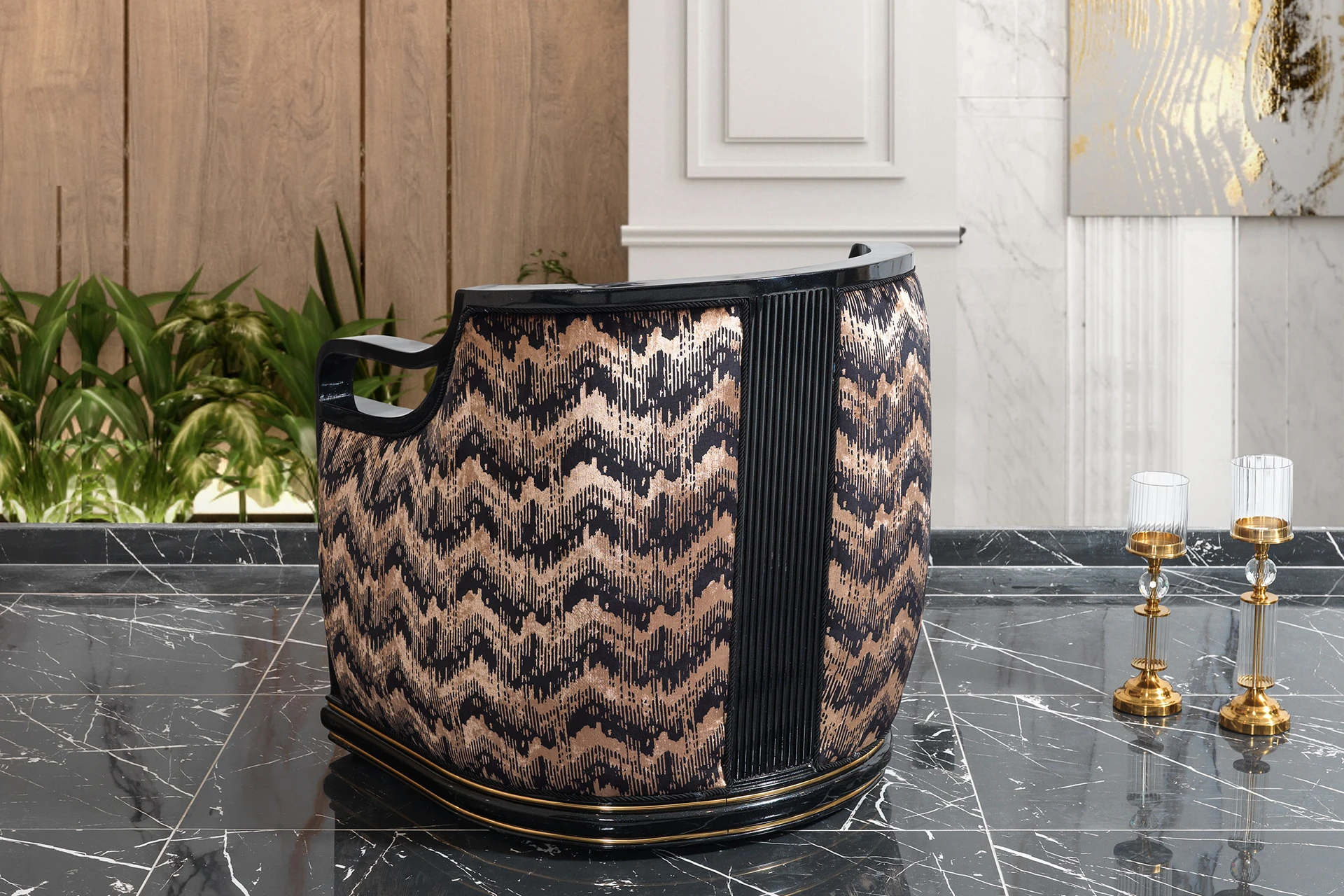 The Zeta sofa set brings modern sophistication to any living space. Its sleek silhouette is accentuated with luxurious fabric upholstery featuring subtle geometric patterns. Framed with glossy finishes and metallic accents, the design exudes contemporary elegance. The deep, plush cushions promise maximum comfort, while the armchairs add a distinct visual appeal with their bold patterns and streamlined armrests. A mirrored coffee table with a structured base completes the ensemble, creating a refined yet inviting atmosphere. Perfect for those who appreciate high-end modern aesthetics in their living room.