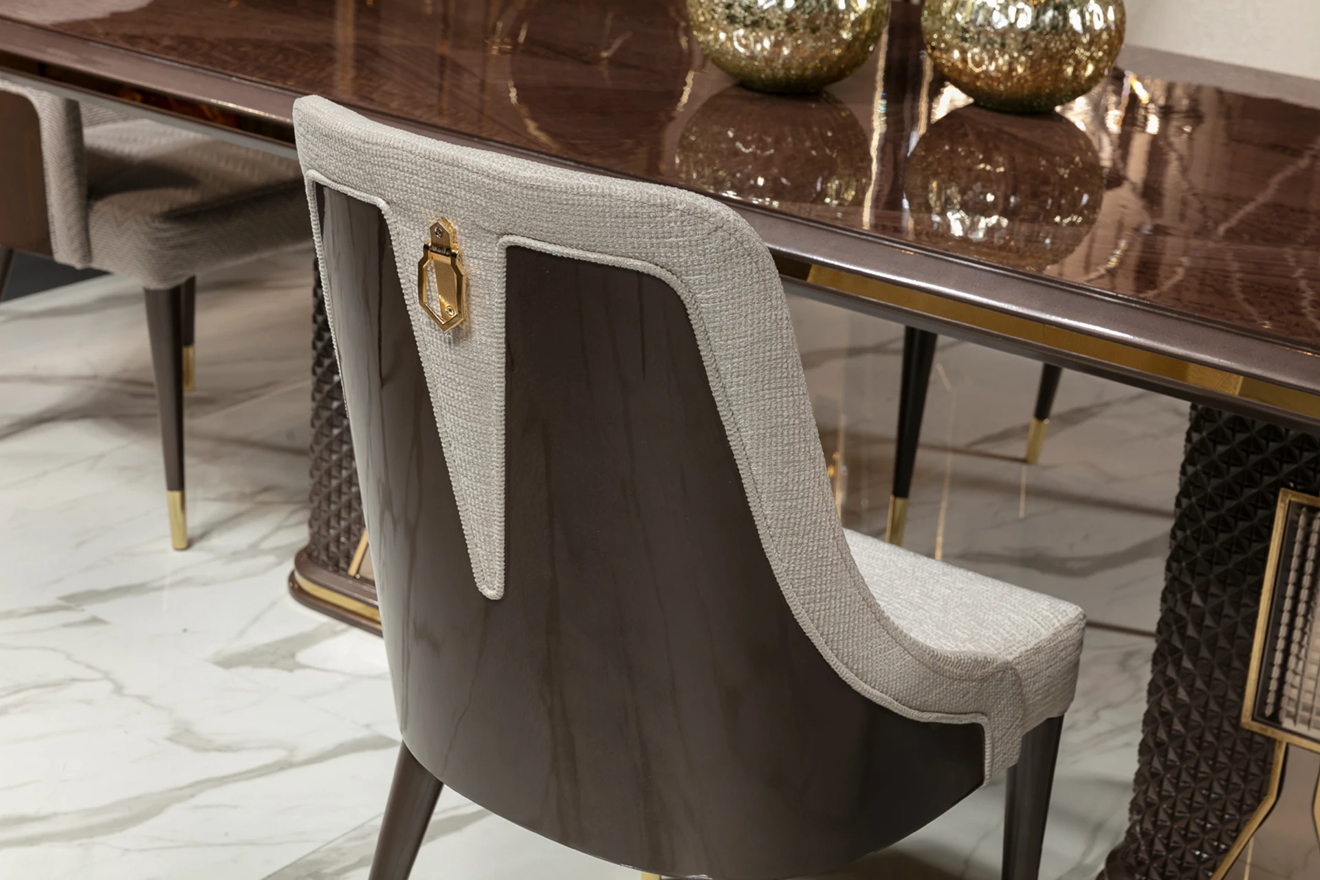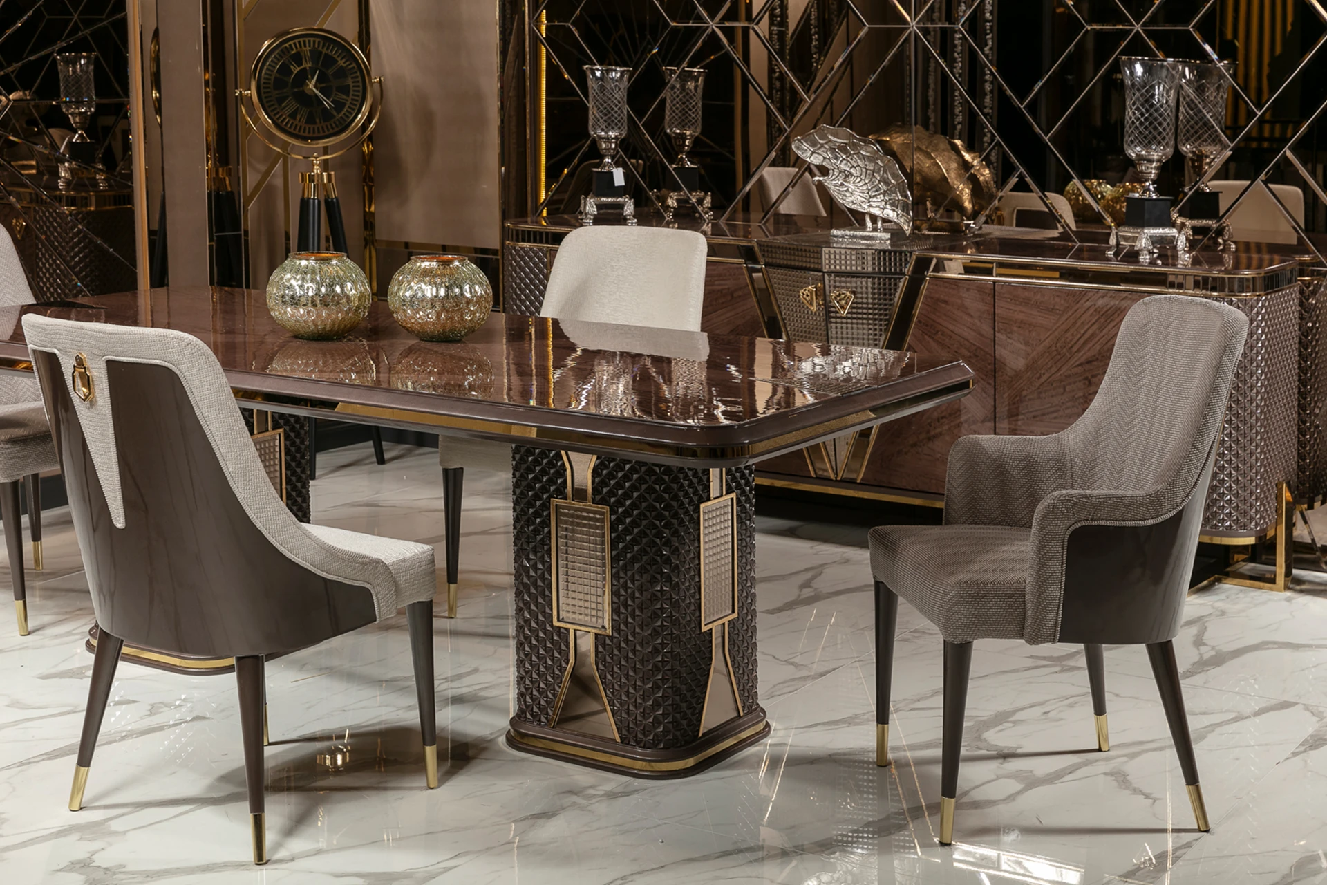 The Zilar dining room set is a perfect blend of elegance and modern luxury. Its sophisticated design is defined by sleek lines, reflective surfaces, and intricate geometric patterns that add depth and dimension to the room. The set features a rich, polished wood dining table with metallic accents, providing a stunning focal point for any dining area. Comfortable, high-back chairs with luxurious upholstery complement the table, making it ideal for both formal and casual dining experiences. The mirrored elements and ornate detailing on the sideboard enhance the overall opulent feel, creating a space that is both inviting and awe-inspiring.