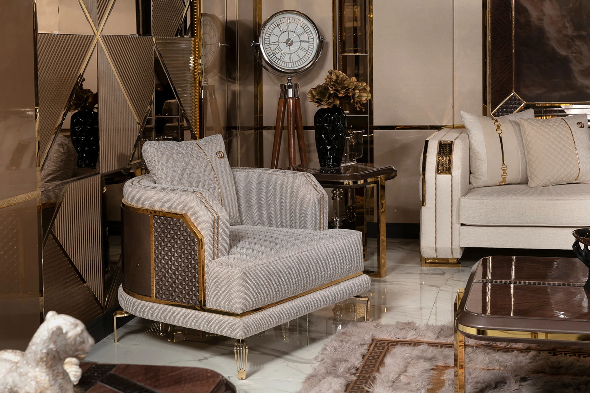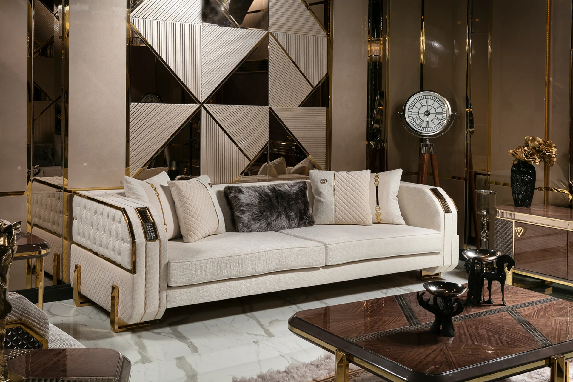 The Zilar sofa set exudes luxury and modern sophistication with its sleek lines and elegant detailing. This set combines comfort and style, featuring plush seating that is both inviting and visually striking. The subtle metallic accents on the arms and legs create a harmonious contrast with the soft upholstery, adding a touch of opulence to the design. Perfectly suited for contemporary living spaces, this sofa set provides a luxurious yet practical seating solution that elevates the ambiance of any room.