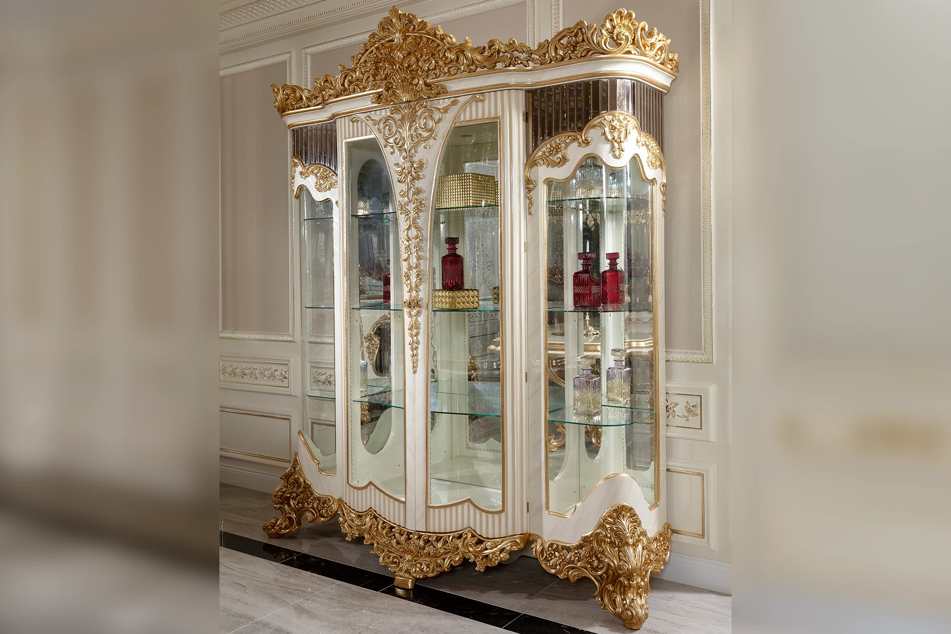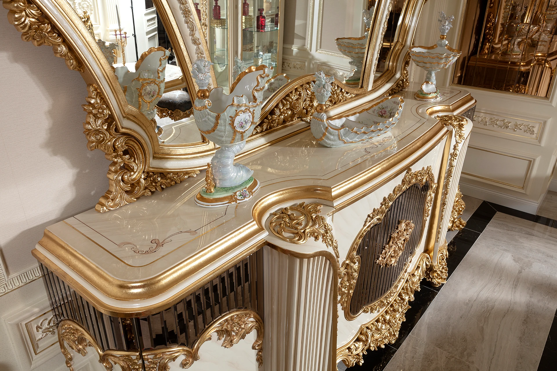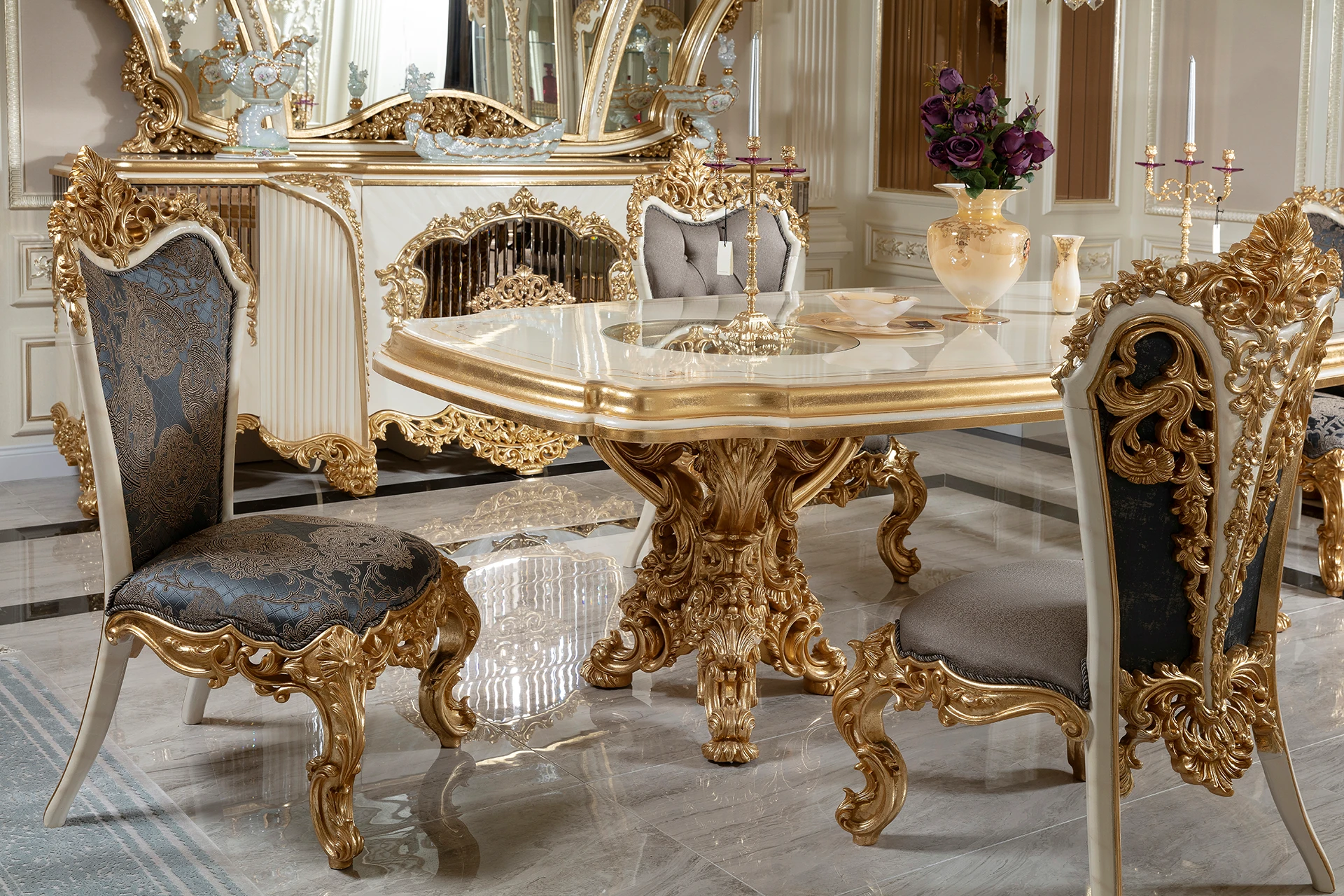 The Zumrut dining room set exudes opulence and sophistication, making it a true statement of luxury. The intricate gold carvings on the chairs and table base add a regal charm, while the elegant curves of the dining table invite an air of grandeur. With a stunning, polished surface and gold accents throughout, this set is designed to impress in any formal dining space. The buffet and display cabinet, adorned with matching ornate details, provide both style and function, making this set the centerpiece of any classic dining room. Perfect for those who appreciate timeless elegance and luxurious craftsmanship.